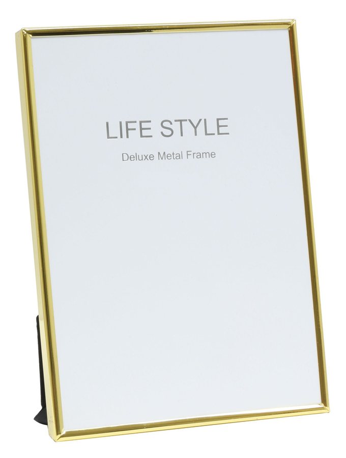 Ce cadre photo en métal couleur doré donnera à vos photos l’encadrement qu’elles méritent. Cette moulure fine est disponible pour plusieurs formats photo et est prévue d’un verre normal de qualité et d’un dos en velours noir avec pied à poser.